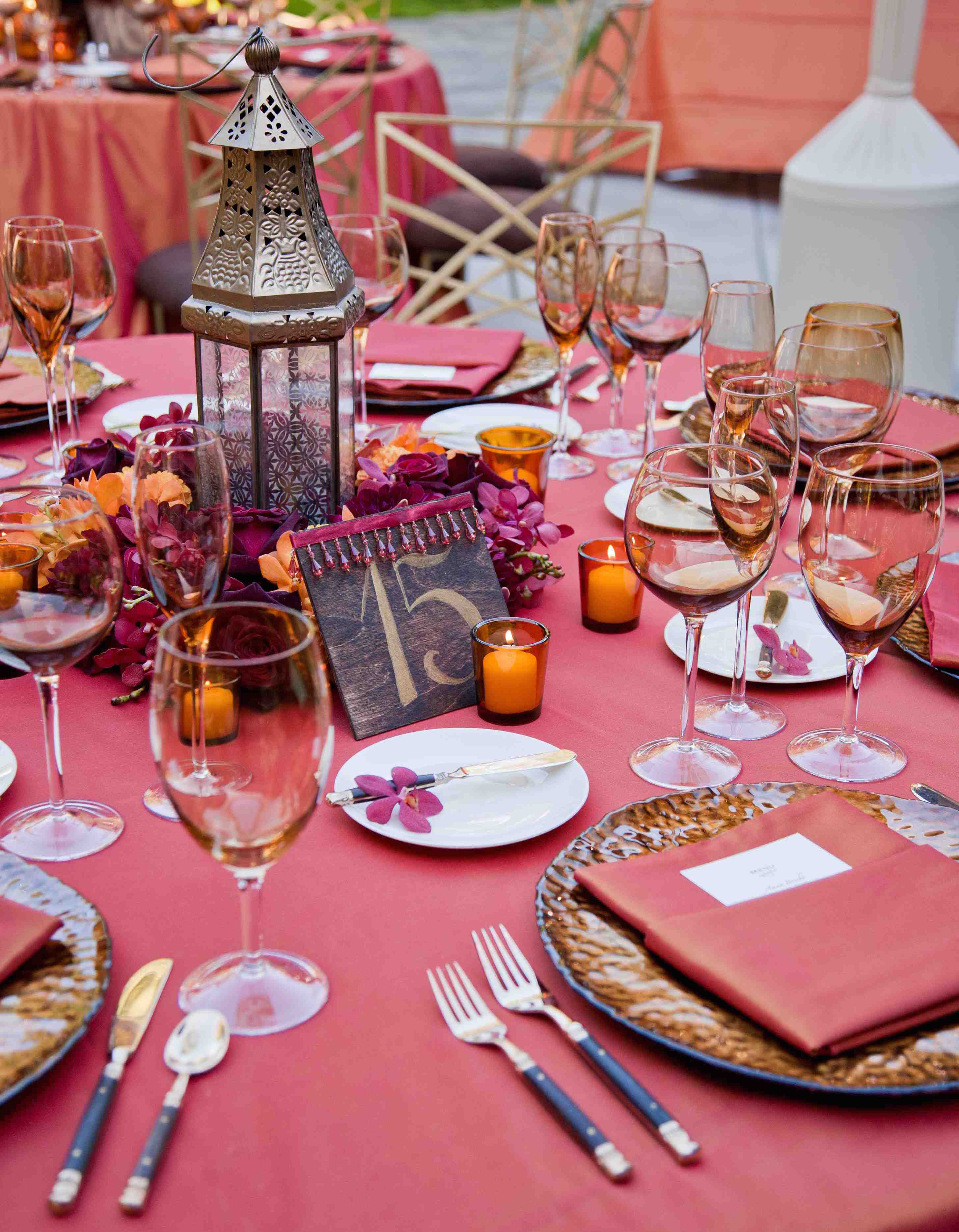 Soft pink or blush antique-style crystal-cut glassware is ideal for a vintage or shabby chic wedding, while amber-hued wine goblets create a warm ambience for a modern fête. Sage-colored drinkware is ideal for a rustic weddings featuring green, textured centerpiece arrangements, and blue-tinted glassware of all kinds can add a strinking element to any tablescape. Other popular glassware shades include purple – perfect for weddings with a purple color palette, as well as red and even black.